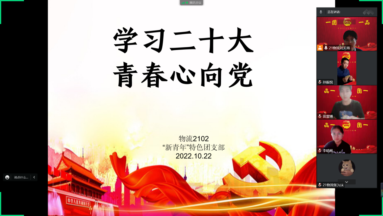 10月16日上午10时,中国共产党第二十次全国代表大会在北京人民大会堂隆重开幕。习近平总书记代表十九届中央委员会向大会作报告。伟德国际bevictor21级物流管理02“新青年”理论学习型“一团一品”特色团支部于10月22日下午两点半举办线上专题学习会。