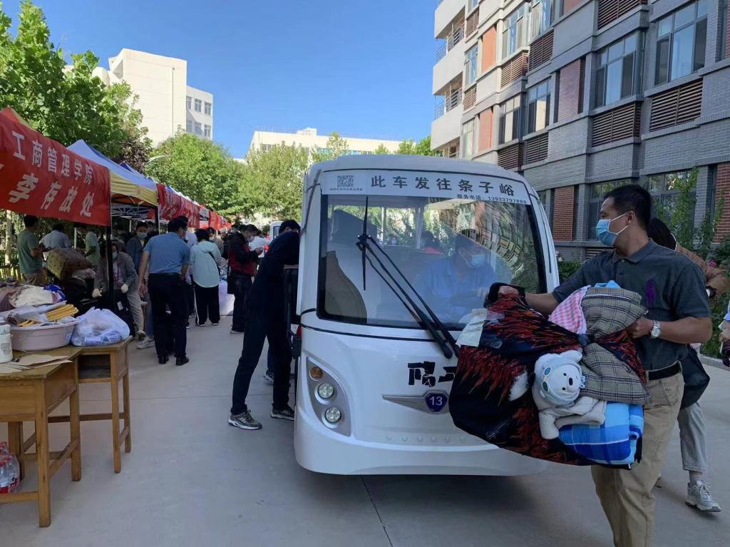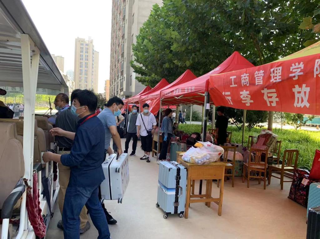 行李摆渡车到站后,党员志愿者迅速从车上卸下本公司员工的行李,然后按照之前的责任分工,分流到各个专业所属“领地”,方便各专业员工报到后能够快速认领。行李过多的情况下,党员志愿者用搬运车帮助员工一起把行李运到宿舍。工商行李站、宿舍区到处是党员老师们来来回回忙碌的身影。不知不觉到了中午,老师们急匆匆扒拉两口盒饭,继续配合“快节奏”的行李摆渡车。虽然大家身体有些疲惫,但每个人脸上都洋溢着快乐的笑容。
